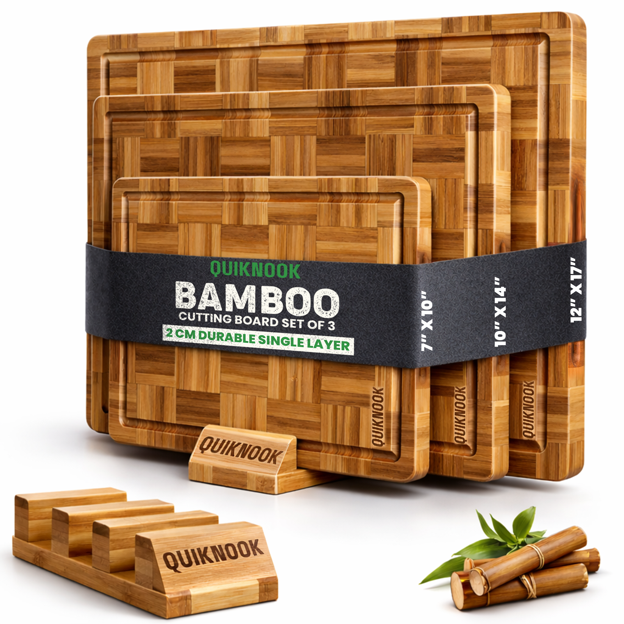 Bamboo Cutting Board Set of 3 with Holder | Non-Slip End Grain Chopping Block | Heavy-Duty Knife-Safe Bamboo Wood Cutting Boards for Kitchen Prep | Deep Juice Groove for Meat Veggies & Fruits